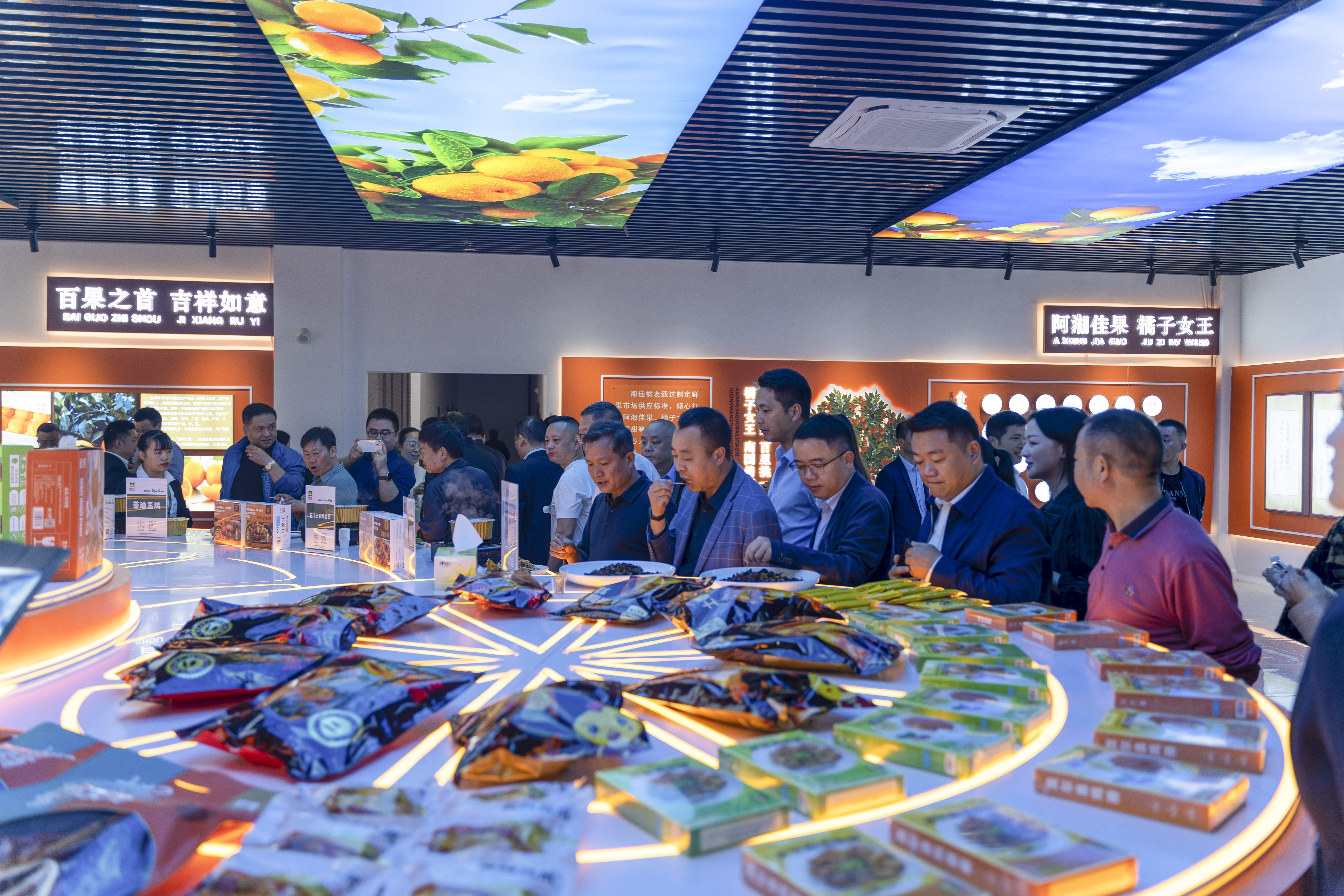 未進其門,已聞其香。但見巨大的圓形展臺上,湘佳茶油蒸雞、湘佳肥腸、湘佳醬板雞、醬板鴨、湘佳醬香豬蹄、湘佳橘子女王……湘佳美食琳瑯滿目,香飄四溢。在工作人員的熱情邀請下,喝雞湯,夾肥腸,啃豬蹄,品柑橘,談感受……
