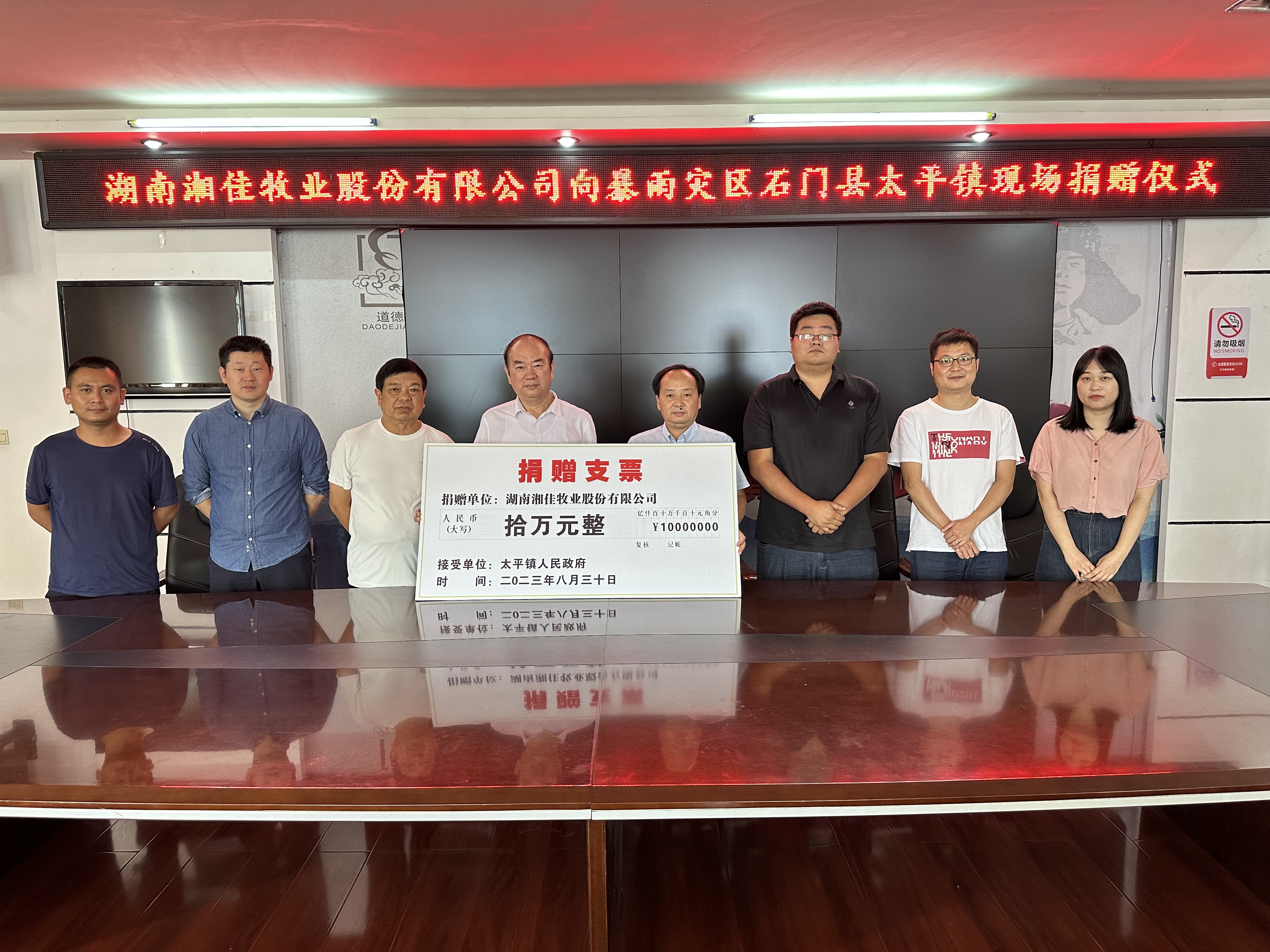 8月30日上午,石門本土上市企業湖南湘佳牧業股份有限公司(以下簡稱“湘佳股份”)捐資10萬元,助力石門縣太平鎮災后重建工作。